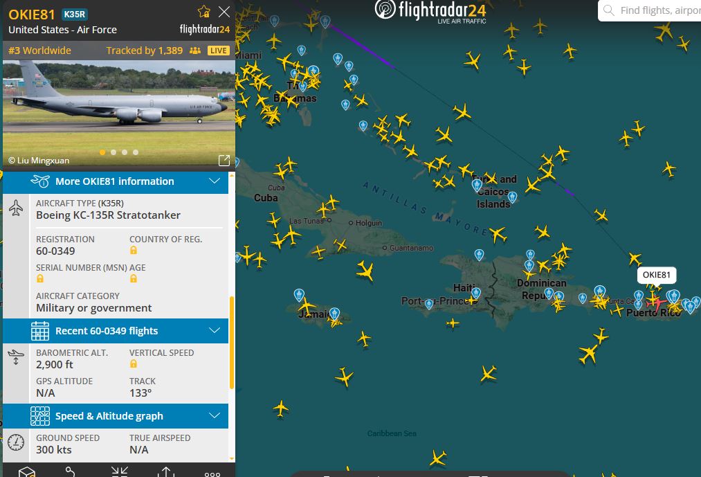 Un Boeing KC-135R Stratotanker de la Fuerza Aérea de Estados Unidos (USAF), identificado como OKIE81, aterrizó la noche del 18 de noviembre en el Aeropuerto Internacional Luis Muñoz Marín de San Juan.