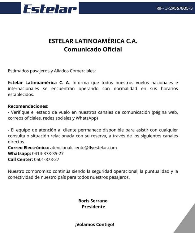 Boris Serrano, presidente de la aerolínea Estelar informó este domingo que todos sus vuelos nacionales e internacionales se mantienen operativos con normalidad, a pesar de que varias compañías han cancelado sus viajes luego del aviso de la Administración Federal de Aviación (FAA, en inglés) de EEUU de «extremar la precaución» al sur del mar Caribe.