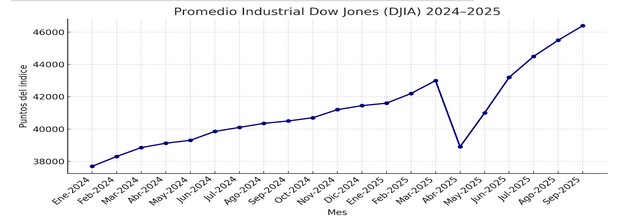 4 Después de una fuerte caída en abril, consecuencia de la guerra de aranceles el mercado bursátil se ha recuperado llegando a nuevos altos. El Dow Jones al 30 de septiembre de 2025, cerró en 46.397 puntos. Aunque la Reserva Federal mantuvo tasas altas durante parte del año, a partir del segundo trimestre moderó su discurso e insinuó posibles recortes si la inflación seguía bajando. Eso redujo el rendimiento de los bonos y aumentó el atractivo de las acciones. Los mercados anticiparon una etapa de política monetaria más laxa.