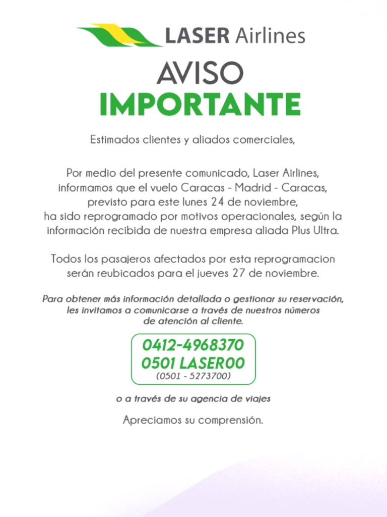 Laser Airlines anunció este lunes la reprogramación de su vuelo Caracas-Madrid-Caracas, previsto originalmente para este 24 de noviembre.