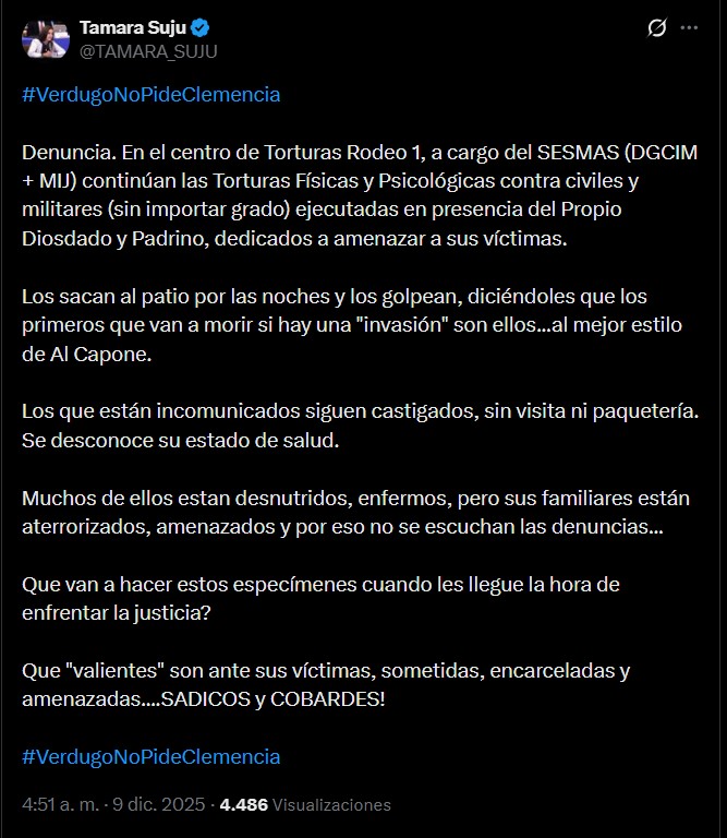 Según Suju, el penal, actualmente bajo control del SESMAS (estructura conjunta entre la DGCIM y el Ministerio de Interior y Justicia), se ha convertido en un espacio donde los detenidos son sometidos a golpizas y amenazas durante la noche. La abogada aseguró que estos abusos ocurren incluso “en presencia del propio Diosdado Cabello y Vladimir Padrino López”, quienes supuestamente se dedican a intimidar a las víctimas.