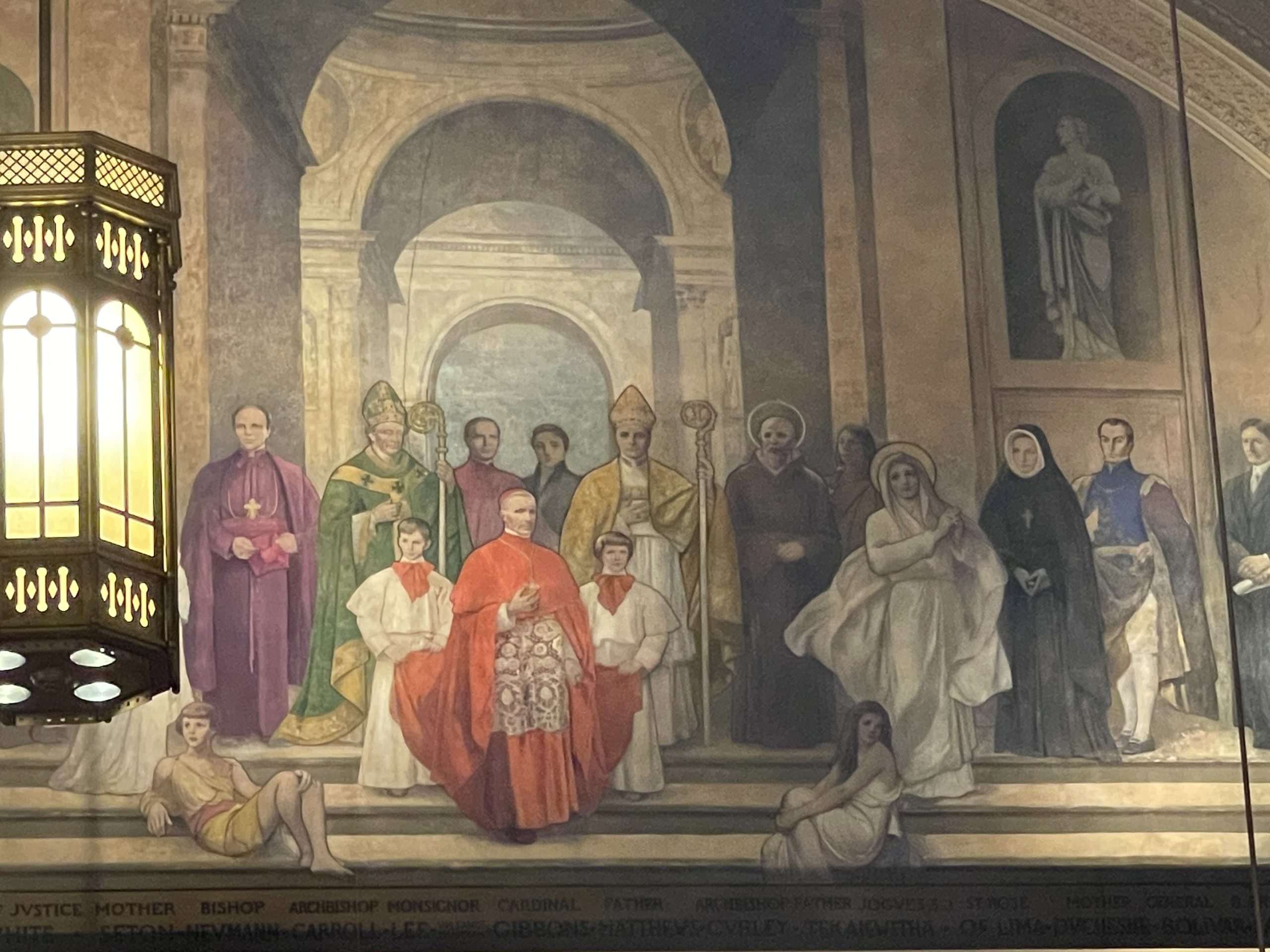 Entre las figuras representadas destacan Frances Mary Saul; Sor Benedicta Fenwick; B. Francis Saul; Santa Philippine Duchesne; Santa Rosa de Lima; la beata Kateri Tekakwitha; San Isaac Jogues; el arzobispo Michael Curley; William Matthews; el cardenal James Gibbons; monseñor Thomas Lee; el arzobispo John Carroll; el obispo John Neumann; Santa Elizabeth Ann Seton; el juez presidente Edward Douglass White; Santa Katharine Drexel; el general Charles Ewing; Dame Margaret Brent y Mother Angelica Holton. En medio de este conjunto plural figura el general Simón Bolívar (1783–1830).
