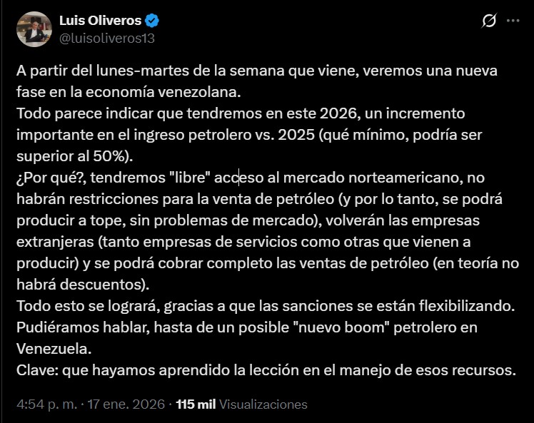 A través de un mensaje publicado en su cuenta de X, Oliveros indicó que todo apunta a que este año el país registrará un aumento de los ingresos petroleros superior al 50 % en comparación con 2025, impulsado por varios factores clave vinculados a la flexibilización de las sanciones.