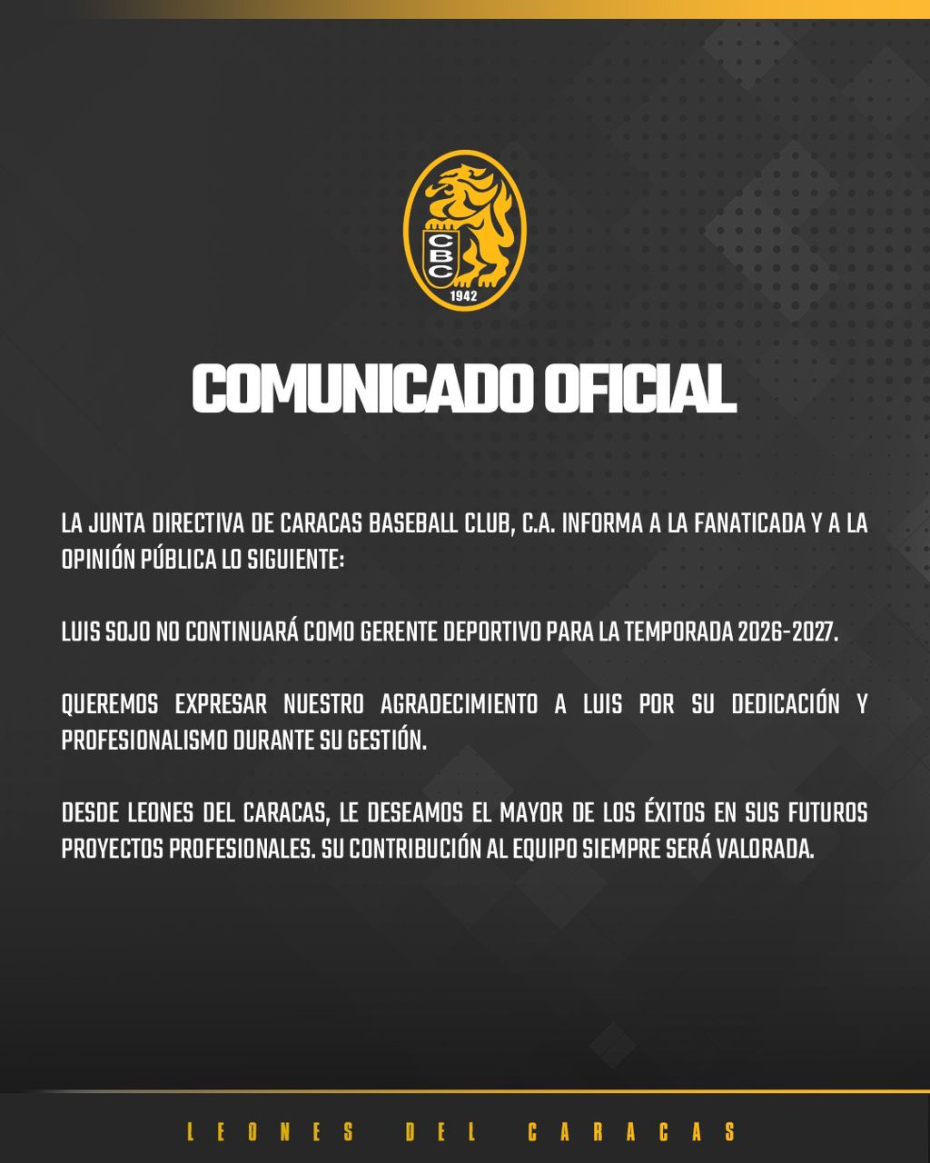 La dirigencia de los Leones del Caracas anunció este viernes 13 de febrero que Luis Sojo no seguirá al frente de la gerencia deportiva de la organización para la temporada 2026-2027.