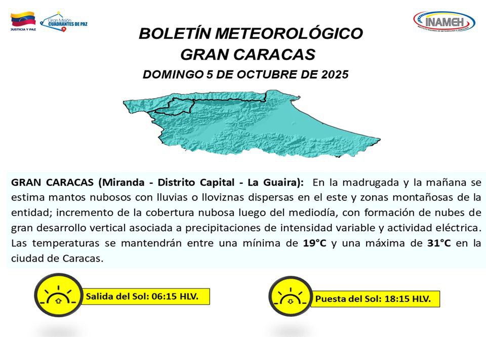 El Instituto Nacional de Meteorología e Hidrología (Inameh) reportó que este domingo 5 de octubre Venezuela amanece bajo la influencia de abundante nubosidad, con lluvias y chubascos que afectan buena parte del territorio nacional, especialmente en el sur, centro y occidente del país.