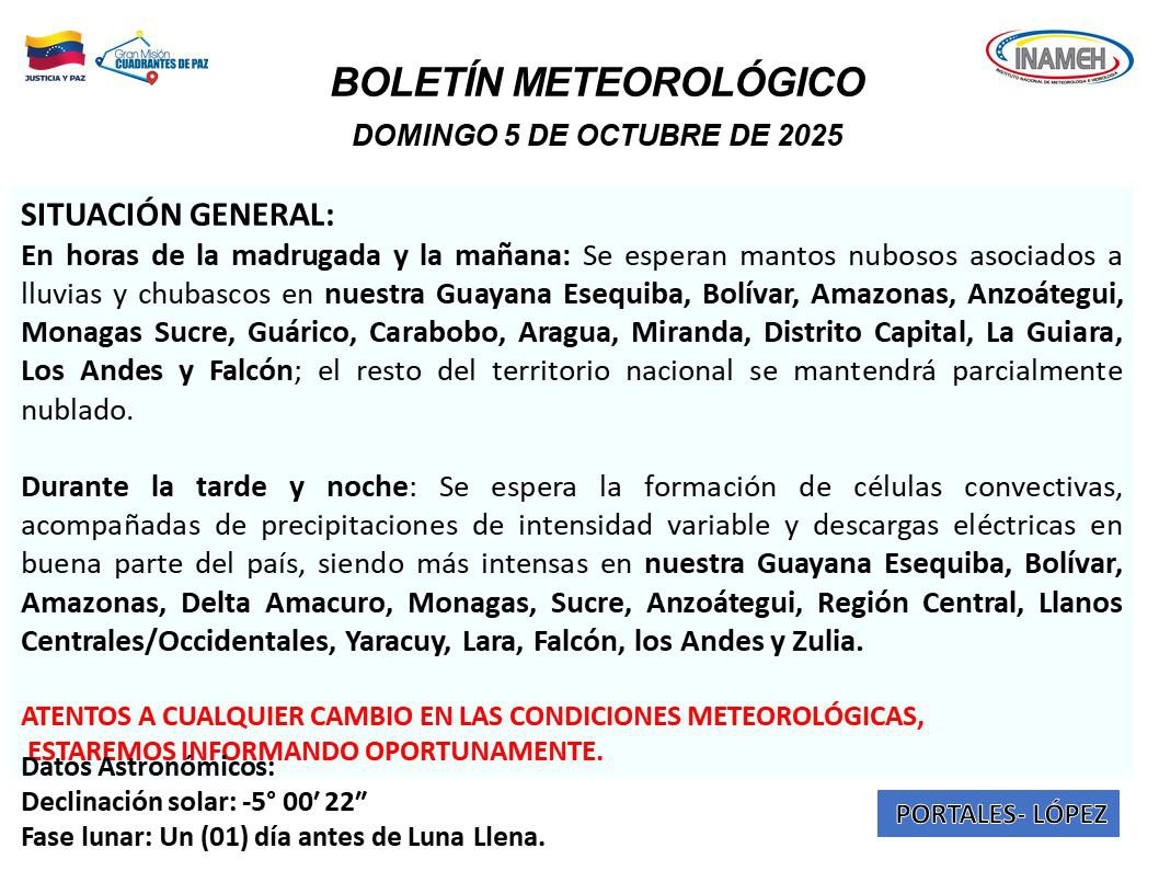 Durante la tarde y noche, se espera la formación de células convectivas acompañadas de lluvias de intensidad variable y descargas eléctricas en gran parte del país, siendo más frecuentes e intensas en Guayana Esequiba, Bolívar, Amazonas, Delta Amacuro, Monagas, Sucre, Anzoátegui, Llanos Centrales y Occidentales, Yaracuy, Lara, Falcón, los Andes y Zulia.