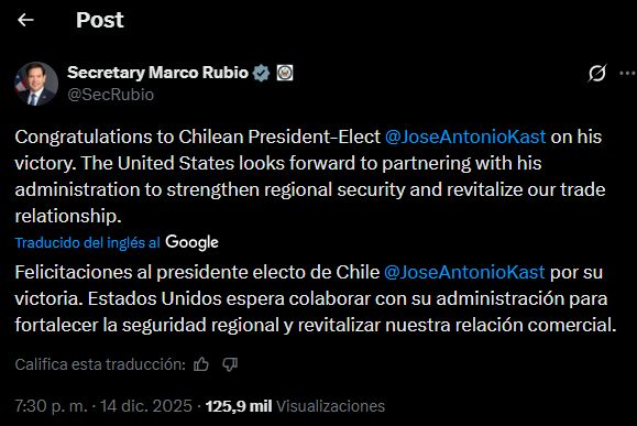 El secretario de Estado de EE.UU., Marco Rubio, felicitó este domingo 14 de diciembre al presidente electo de Chile, José Antonio Kast, por su victoria electoral y señaló que, bajo su liderazgo, Chile priorizará el control de la inmigración ilegal y la revitalización de la relación comercial bilateral.