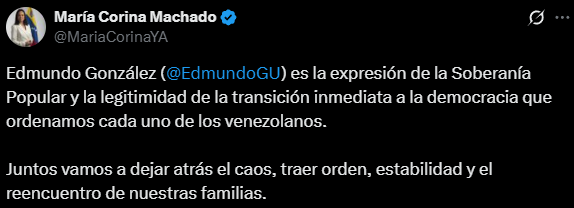 «Edmundo González es la expresión de la soberanía popular y la legitimidad de la transición inmediata a la democracia que ordenamos cada uno de los venezolanos. Juntos vamos a dejar atrás el caos, traer orden, estabilidad y el reencuentro de nuestras familias», prometió Machado en redes sociales.