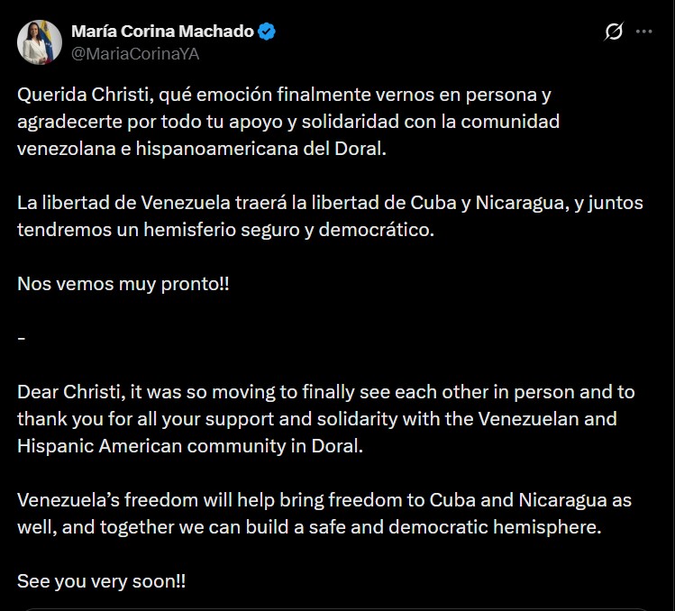 “Querida Christi, qué emoción finalmente vernos en persona y agradecerte por todo tu apoyo y solidaridad con la comunidad venezolana e hispanoamericana del Doral”, escribió.