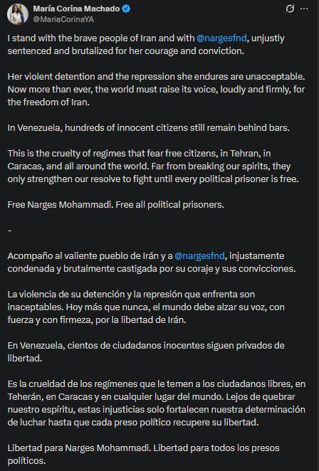 A través de un mensaje compartido en su cuenta de X, Machado condenó la detención y represión que enfrenta Mohammadi, calificándolas como «inaceptables».