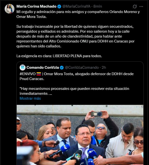 La líder democrática venezolana y Premio Nobel de la Paz 2025, María Corina Machado, expresó este lunes 9 de febrero su admiración por los activistas y defensores de derechos humanos Orlando Moreno y Omar Mora Tosta, quienes reaparecieron públicamente en Caracas tras más de un año resguardados en la clandestinidad.