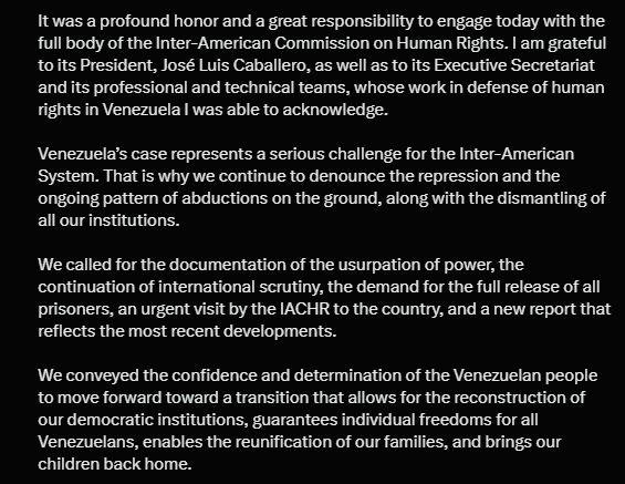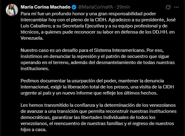 En un mensaje publicado en su cuenta oficial de X, Machado afirmó que fue un “profundo honor y una gran responsabilidad” dialogar con los miembros de la Cidh, agradeciendo al presidente del organismo, José Luis Caballero, a la Secretaría Ejecutiva y al equipo técnico por su labor en defensa de los derechos humanos.