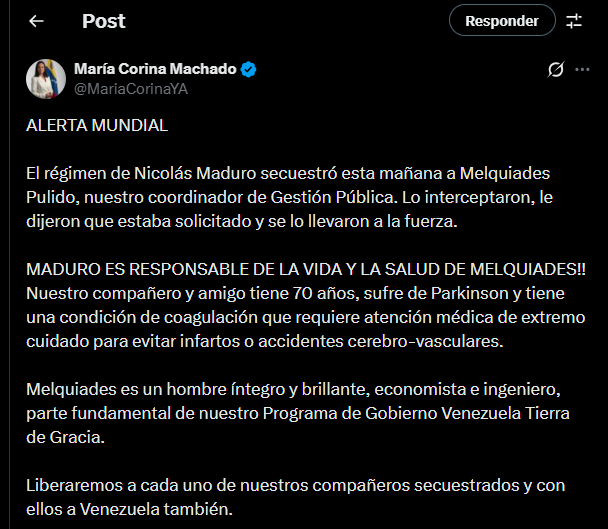 “Maduro es responsable de la vida y la salud de Melquiades”, advirtió Machado en su publicación.