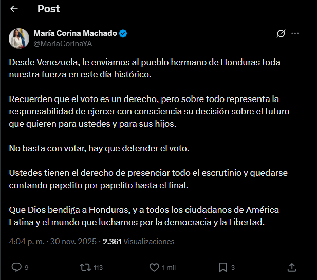 Desde Venezuela, la líder de las fuerzas democráticas, Maria Corina Machado, compartió la tarde de este domingo 30 de noviembre un mensaje de apoyo al pueblo hondureño en el marco de las elecciones generales 2025 realizadas en Honduras.