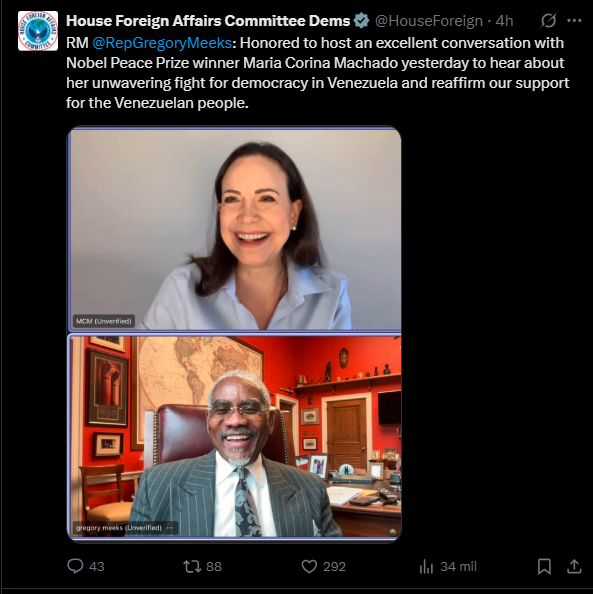 El Comité de Asuntos Exteriores de la Cámara de Representantes de Estados Unidos, compartió la tarde del miércoles 19 de noviembre un mensaje en su cuenta oficial de X en el que difundió un comentario del congresista demócrata Gregory Meeks, miembro destacado de ese comité, sobre una conversación virtual que sostuvo con la líder de las fuerzas democráticas de Venezuela, María Corina Machado.