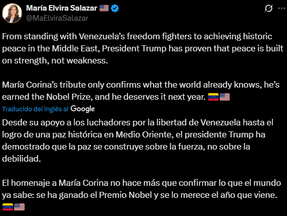 «Desde su apoyo a los luchadores por la libertad de Venezuela hasta el logro de una paz histórica en Medio Oriente, el presidente Trump ha demostrado que la paz se construye sobre la fuerza, no sobre la debilidad», enfatizó Salazar en sus redes sociales.