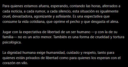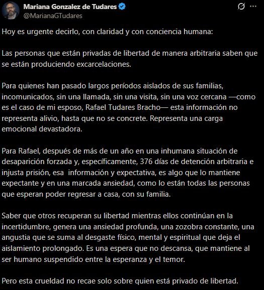 A través de una publicación en su cuenta de X, González explicó que las personas privadas de libertad de manera arbitraria saben que se están produciendo liberaciones, pero que esa información no representa alivio mientras no se materialice. Por el contrario, dijo, «genera una carga emocional devastadora, especialmente para quienes han pasado largos períodos incomunicados y aislados de sus familias».