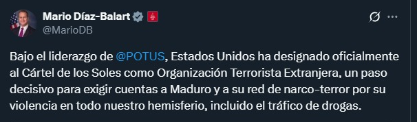 “Bajo el liderazgo de @POTUS (Presidente de EEUU), Estados Unidos ha designado oficialmente al Cártel de los Soles como Organización Terrorista Extranjera, un paso decisivo para exigir cuentas a Maduro y a su red de narco-terror por su violencia en todo nuestro hemisferio, incluido el tráfico de drogas”, publicó el funcionario republicano a través de su cuenta en X.