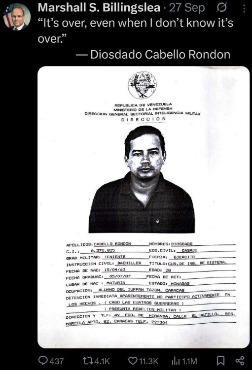 Algunos usuarios no entendieron rápidamente la referencia, pero la cita está relacionada con una publicación anterior de Billingslea en la que decía «It’s over, even when I don’t know it’s over (se acabó, incluso cuando no sé que se acabó». Entonces el mensaje estaba acompañado de la ficha de detención de Diosdado Cabello en el golpe de Estado de 1992.