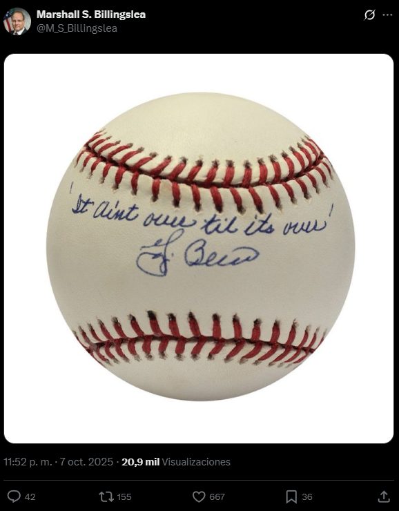 «It ain’t over ‘til it’s over (no se acaba hasta que se acaba)», fue el mensaje que se veía escrito en una pelota firmada por Berra que publicó Billingslea en sus redes sociales.