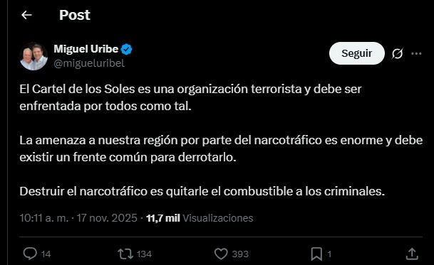 El precandidato presidencial colombiano, Miguel Uribe Londoño, reafirmó este lunes 17 de noviembre su apoyo a la declaración que prepara el gobierno de EEUU, mediante el secretario de Estado, Marco Rubio, para catalogar al Cartel de los Soles como organización terrorista extranjera.