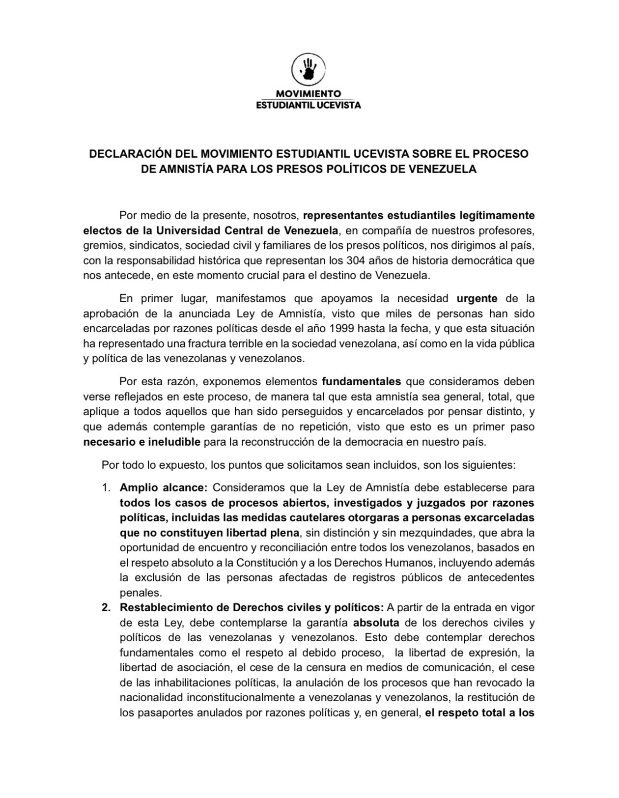Aunque el movimiento estudiantil ucevista respalda la urgencia de una medida que sane la «fractura terrible» de la sociedad, advierten que el proceso no debe ser un gesto simbólico, sino una solución estructural.