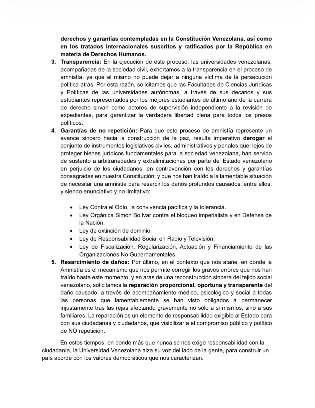 El estudiantado fue enfático en que, para que no haya nuevos presos políticos, se deben derogar instrumentos legales que consideran arbitrarios, entre ellos: La Ley Contra el Odio. La Ley de Fiscalización de las ONG. La Ley de Responsabilidad Social en Radio y Televisión (Ley RESORTE).