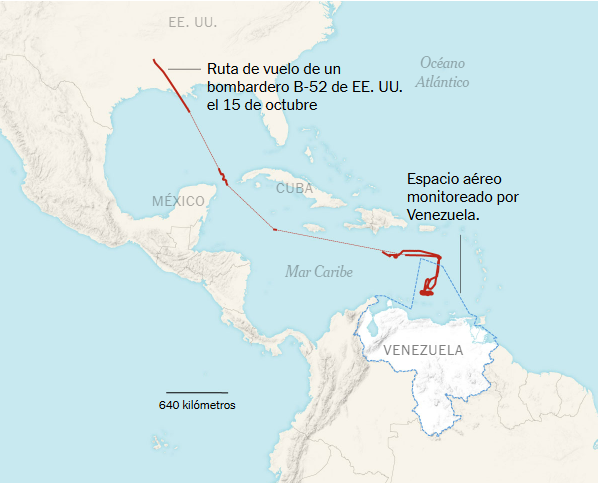 Recientemente se ha producido un dramático despliegue de amenazas aéreas en la región. La semana pasada, al menos dos bombarderos B-52 procedentes de Luisiana volaron frente a la costa de Venezuela durante varias horas, en lo que un alto funcionario estadounidense calificó como “una demostración de fuerza”. Aunque los bombarderos volaron en el espacio aéreo internacional, estuvieron en una región de control del tráfico aéreo gestionada por Venezuela. Los B-52 pueden transportar decenas de bombas de precisión.