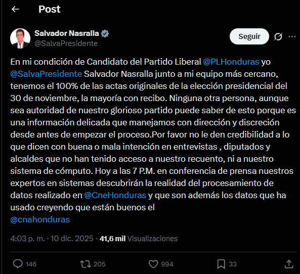El candidato presidencial por Partido Liberal de Honduras (PLH), Salvador Nasralla, publicó un mensaje en sus redes la tarde del miércoles 10 de diciembre, tras el conteo provisional del 99,40 % de las mesas electorales de los comicios del 30 de noviembre.