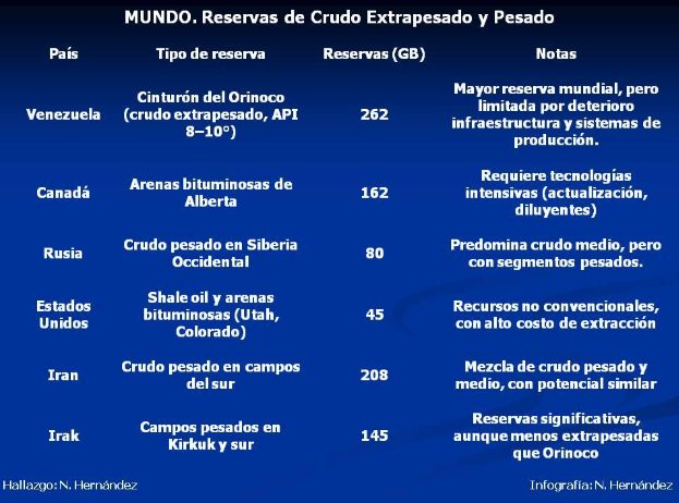En lo atinente a las reservas de pesado y XPesado, la gráfica a continuación muestra los países emblemáticos. México, posee alrededor de 3 GB de crudos pesados.