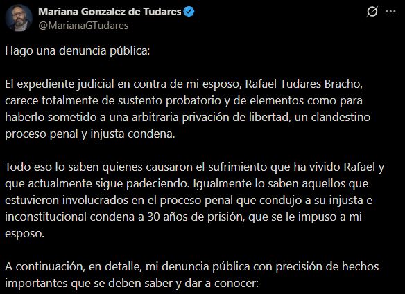 A través de una publicación en su cuenta de X, González aseguró que el caso en contra de Tudares “es un fraude a la justicia”, al afirmar que no existen testigos, evidencias ni hechos demostrables que sustenten los delitos por los cuales fue acusado y condenado.