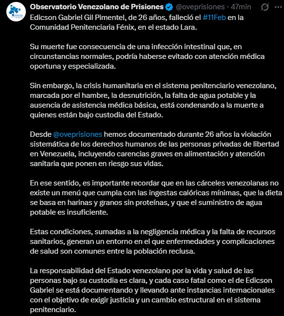 El Observatorio Venezolano de Prisiones (OVP), ONG dedicada desde hace más de dos décadas a la defensa de los derechos humanos en el sistema penitenciario venezolano, denunció este viernes 13 de febrero a través de su cuenta oficial en X (anteriormente Twitter) la muerte de Edicson Gabriel Gil Pimentel, de 26 años, ocurrida el pasado 11 de febrero en la Comunidad Penitenciaria Fénix, en el estado Lara.