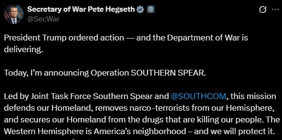 El secretario de Guerra de Estados Unidos, Pete Hegseth, anunció este jueves 13 de noviembre el lanzamiento de la «Operación Lanza del Sur» (Operation Southern Spear), en cumplimiento de una orden directa del presidente Donald Trump.