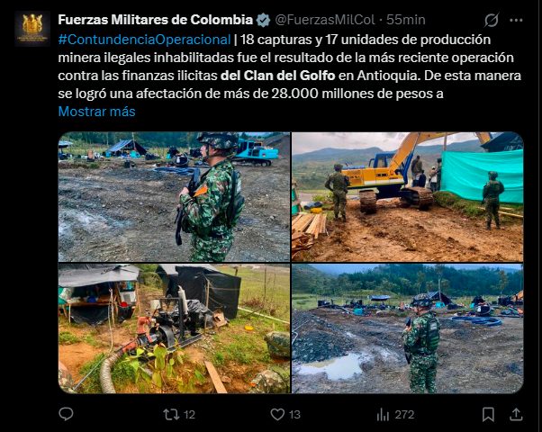 Según informaron fuentes militares este sábado 13 de diciembre, las tropas sostuvieron combates con presuntos integrantes de la subestructura Edwin Román Velásquez Valle del Clan del Golfo y localizaron “varias unidades de producción minera que operaban maquinaria pesada destinada a la explotación ilícita de minerales”.