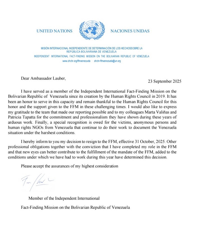 Dos integrantes de la Misión de Determinación de Hechos sobre Venezuela de la Organización de Naciones Unidas (ONU), Francisco Cox Vial y Patricia Tappatá Valdez, presentaron su renuncia al equipo de investigación. Las dimisiones se producen tras varios años de trabajo en la misión establecida por el Consejo de Derechos Humanos.