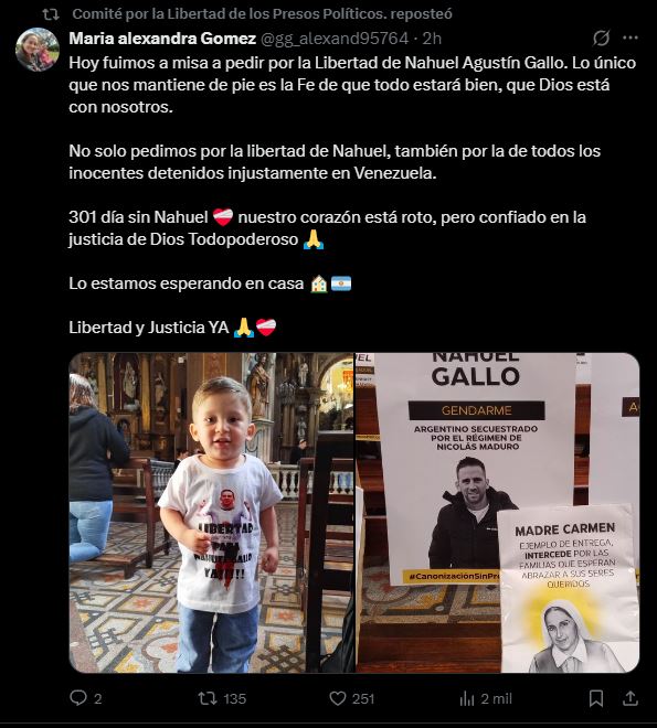 La publicación estuvo acompañada de una fotografía de un niño —el hijo de Gallo— durante una misa en la que la familia pidió por su libertad y la de todos los detenidos políticos en Venezuela.
