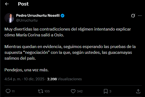 “Muy divertidas las contradicciones del régimen intentando explicar cómo María Corina salió a Oslo. Mientras quedan en evidencia, seguimos esperando las pruebas de la supuesta ‘negociación’ con la que, según ustedes, las guacamayas salimos del país. Pendejos, una vez más”, escribió el dirigente opositor.