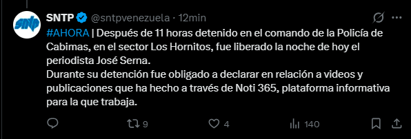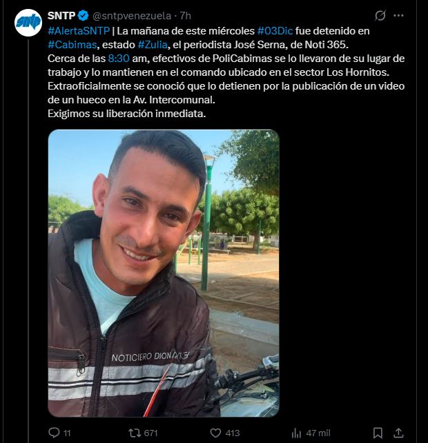 El Sindicato Nacional de Trabajadores de la Prensa de Venezuela (SNTP) informó la mañana de este miércoles sobre la detención del periodista José Serna, colaborador de Noti 365, en la ciudad de Cabimas, estado Zulia.