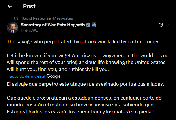 “El salvaje que perpetró este ataque fue asesinado por fuerzas aliadas. Que quede claro: si atacan a estadounidenses, en cualquier parte del mundo, pasarán el resto de su breve y ansiosa vida sabiendo que Estados Unidos los cazará, los encontrará y los matará sin piedad”, escribió Hegseth.