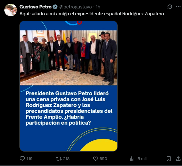«Aquí saludo a mi amigo el expresidente español Rodríguez Zapatero», escribió Petro este miércoles en X, en una publicación acompañada de una fotografía donde aparecieron rodeados de otros dirigentes de la izquierda colombiana.