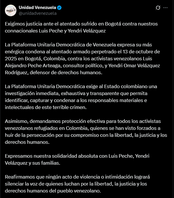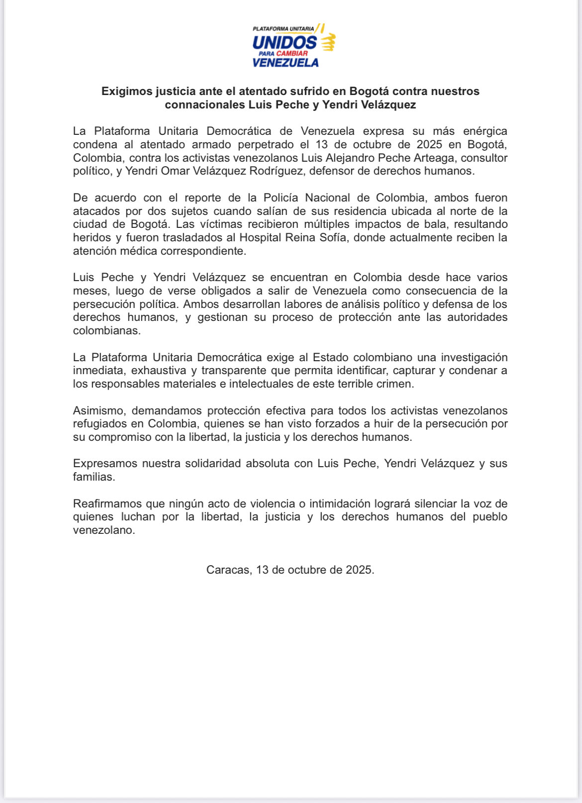 La Plataforma Unitaria Democrática de Venezuela condenó enérgicamente el atentado armado perpetrado este lunes 13 de octubre, contra los activistas venezolanos Luis Alejandro Peche Arteaga y Yendri Omar Velázquez Rodríguez en la ciudad de Bogotá.