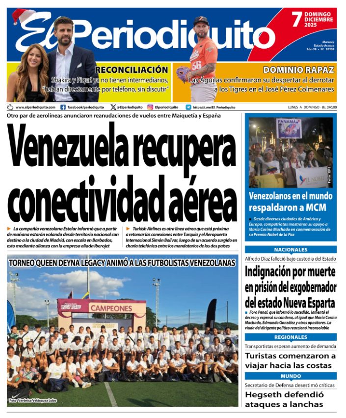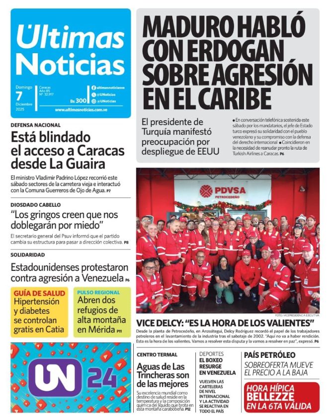 07 Dec 2025, 10:53 • 1 minuto de lectura Portadas de este domingo 7 de diciembre de 2025 Por La Patilla Compartir Compartir noticia Facebook Twitter / X WhatsApp Telegram LinkedIn Copiar enlace Enlaces relacionados Ver noticia original