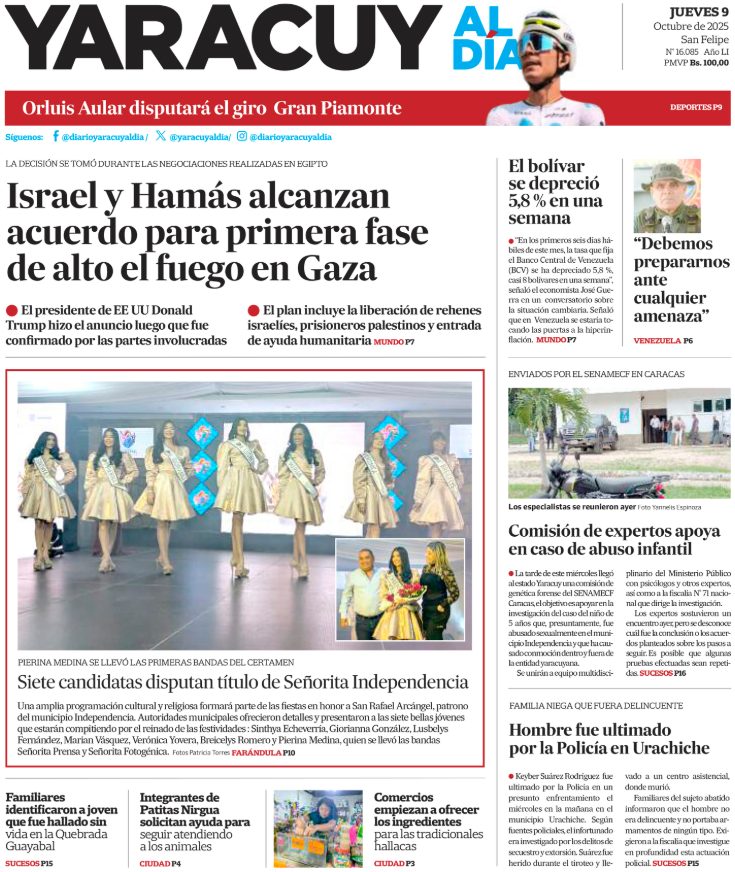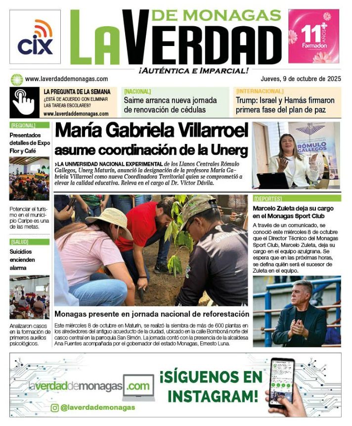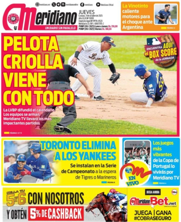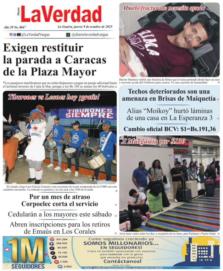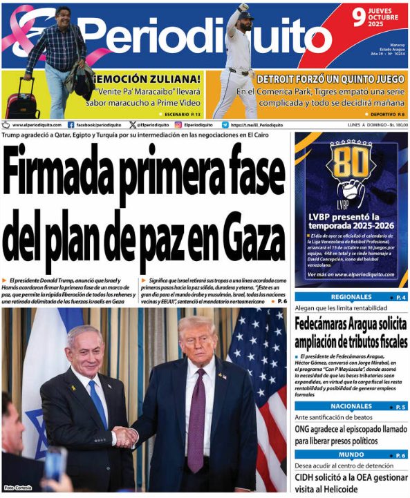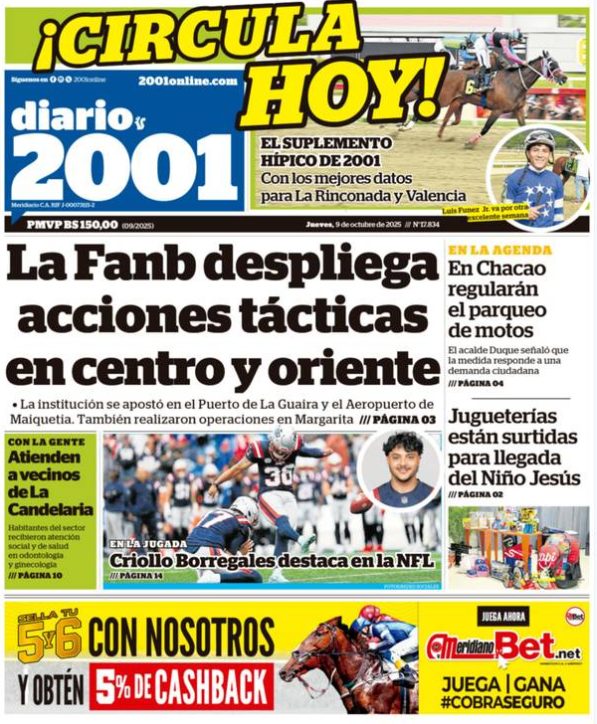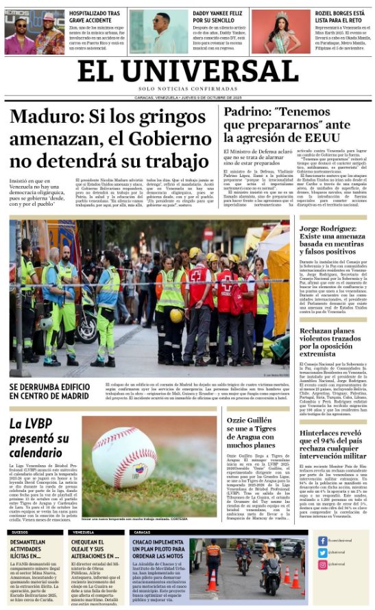 09 Oct 2025, 09:51 • 1 minuto de lectura Portadas de este jueves 9 de octubre de 2025 Por La Patilla Compartir Compartir noticia Facebook Twitter / X WhatsApp Telegram LinkedIn Copiar enlace Enlaces relacionados Ver noticia original
