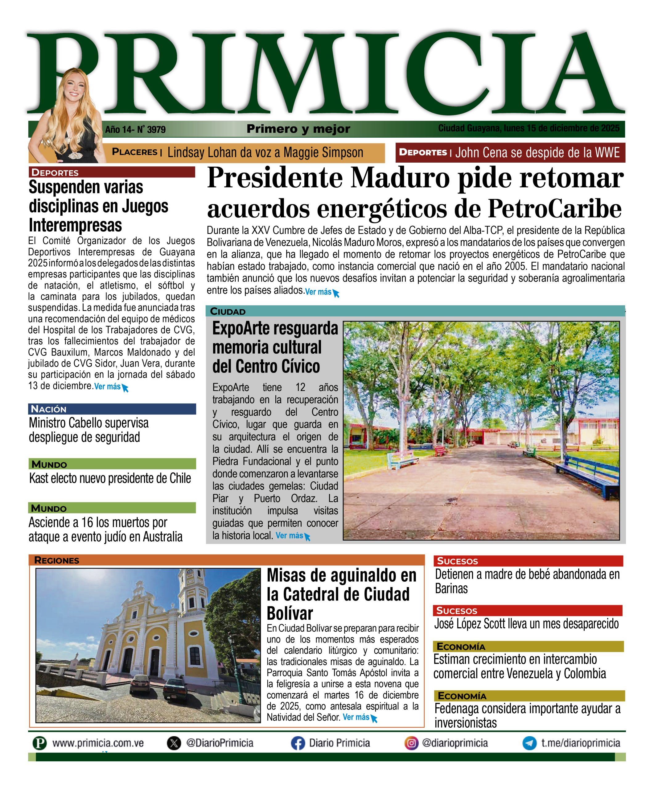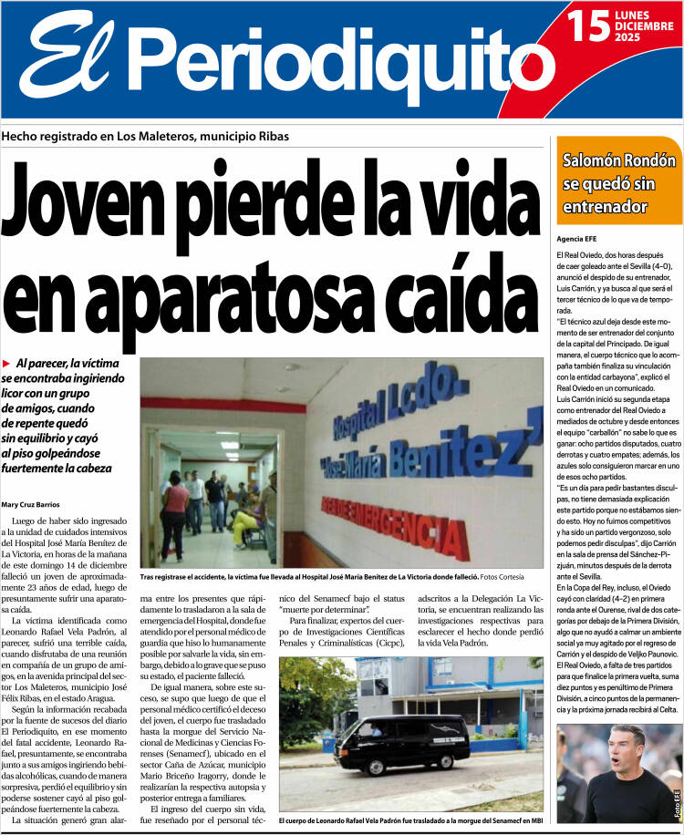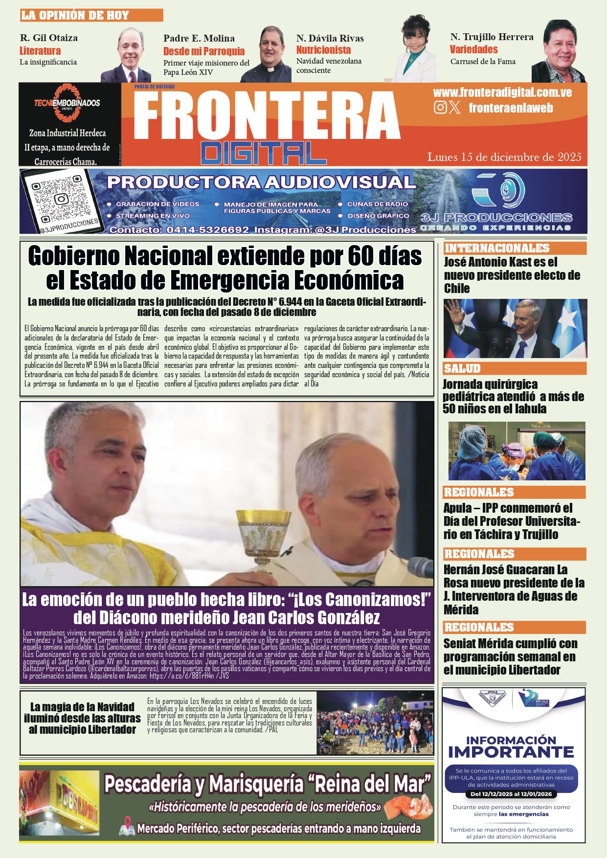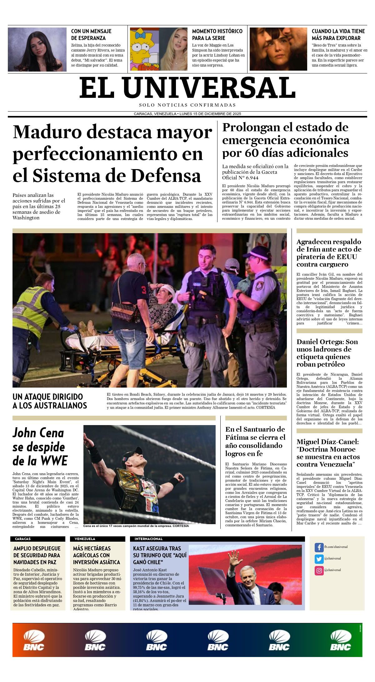 15 Dec 2025, 09:12 • 1 minuto de lectura Portadas de este lunes 15 de diciembre de 2025 Por La Patilla Compartir Compartir noticia Facebook Twitter / X WhatsApp Telegram LinkedIn Copiar enlace Enlaces relacionados Ver noticia original