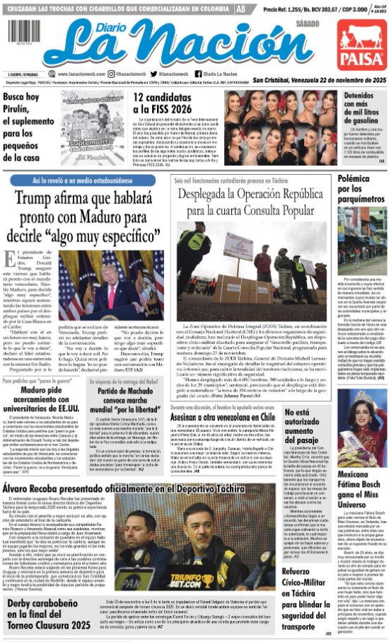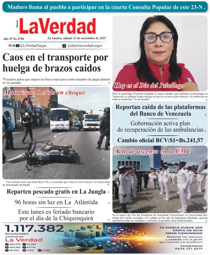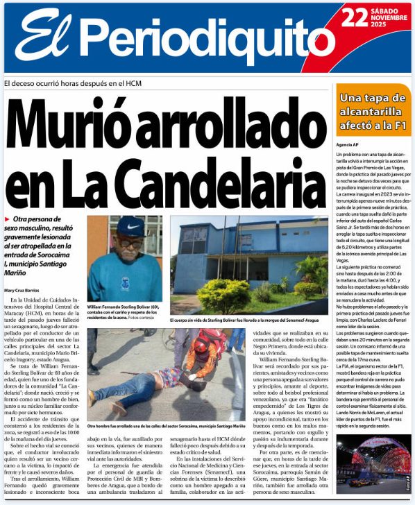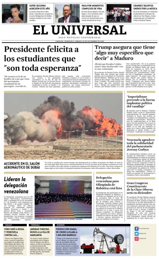 22 Nov 2025, 10:33 • 1 minuto de lectura Portadas de este sábado 22 de noviembre de 2025 Por La Patilla Compartir Compartir noticia Facebook Twitter / X WhatsApp Telegram LinkedIn Copiar enlace Enlaces relacionados Ver noticia original