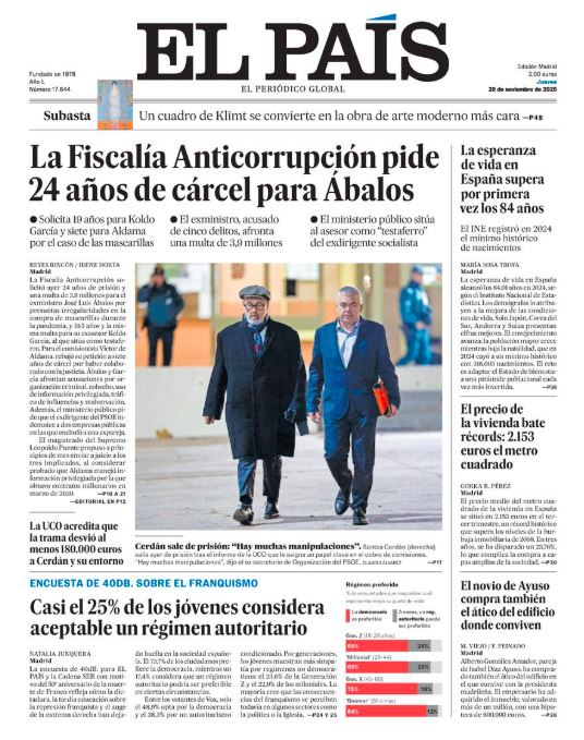 19 Nov 2025, 23:41 • 1 minuto de lectura Portadas de la prensa internacional de este jueves 20 de noviembre de 2025 Por La Patilla Compartir Compartir noticia Facebook Twitter / X WhatsApp Telegram LinkedIn Copiar enlace Enlaces relacionados Ver noticia original