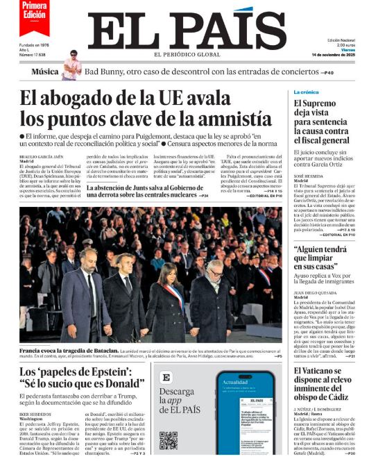 13 Nov 2025, 23:32 • 1 minuto de lectura Portadas de la prensa internacional de este viernes 14 de noviembre de 2025 Por La Patilla Compartir Compartir noticia Facebook Twitter / X WhatsApp Telegram LinkedIn Copiar enlace Enlaces relacionados Ver noticia original