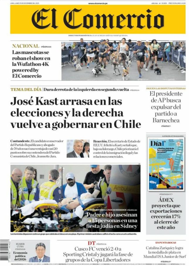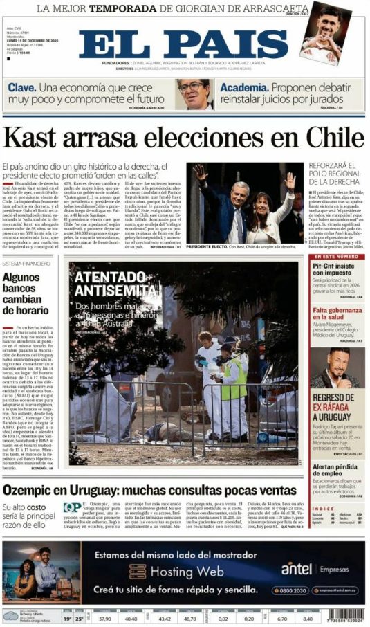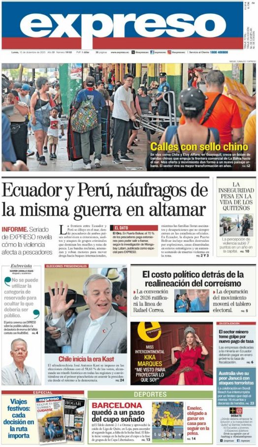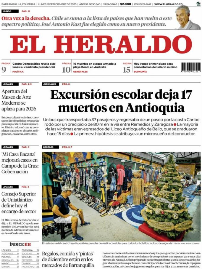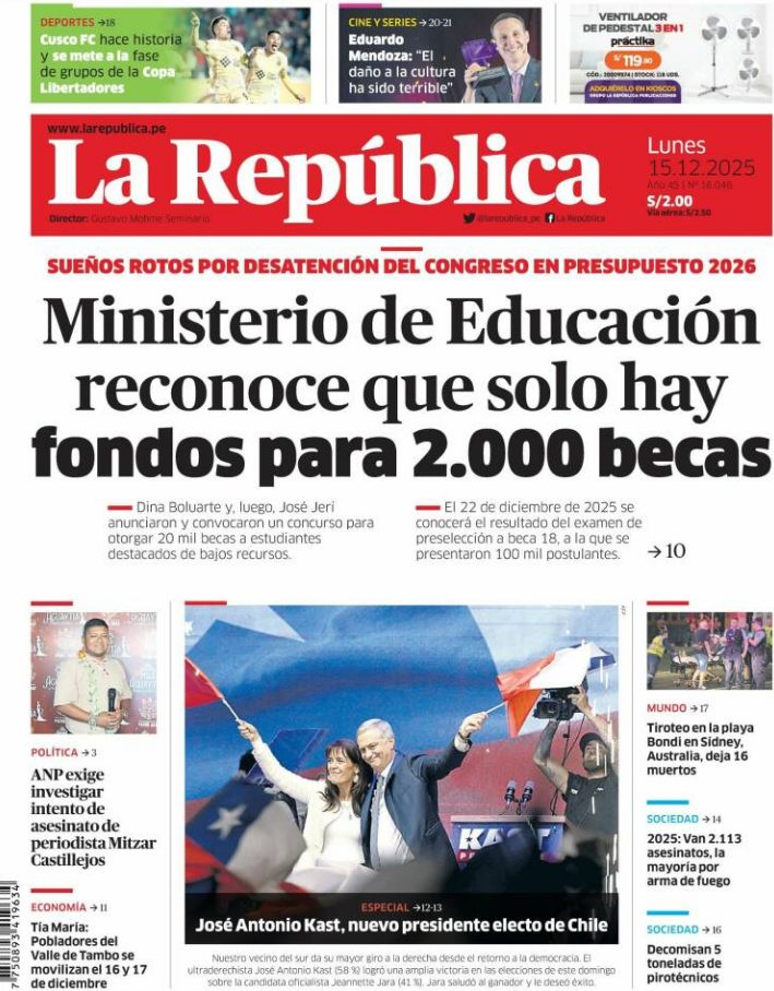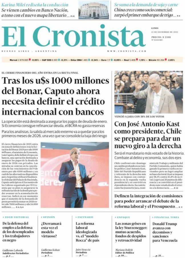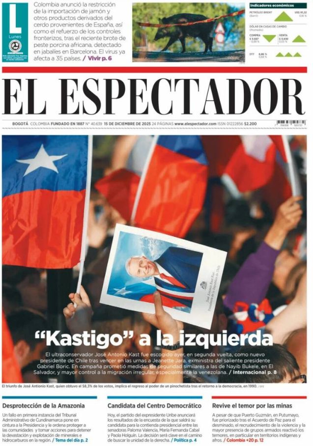 15 Dec 2025, 10:16 • 1 minuto de lectura Portadas latinoamericanas de este lunes 15 de diciembre de 2025 Por La Patilla Compartir Compartir noticia Facebook Twitter / X WhatsApp Telegram LinkedIn Copiar enlace Enlaces relacionados Ver noticia original