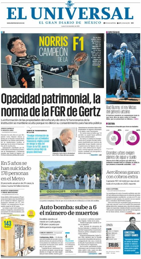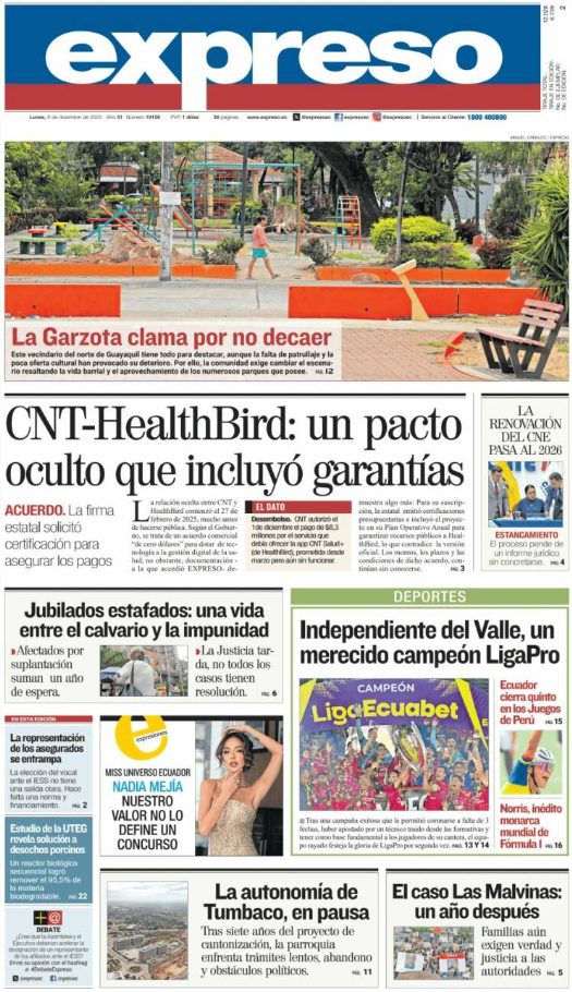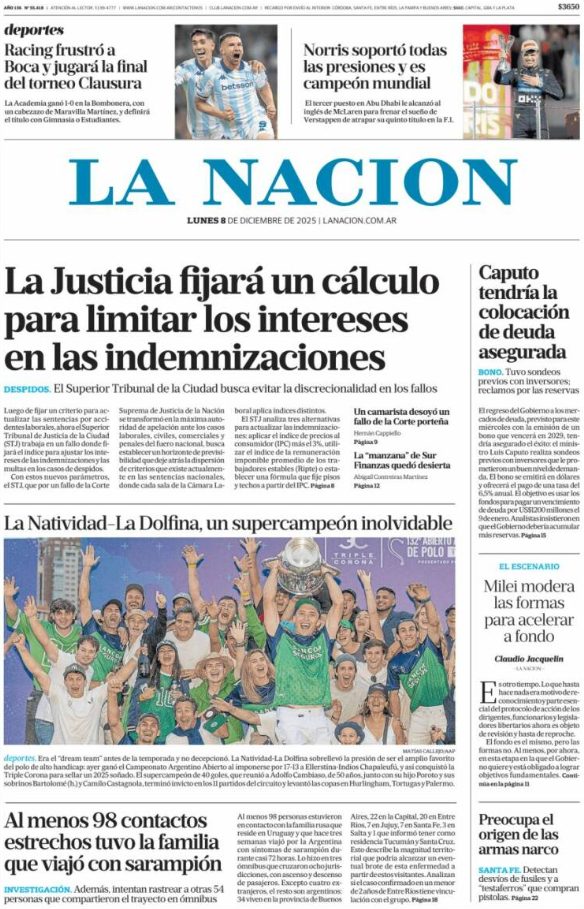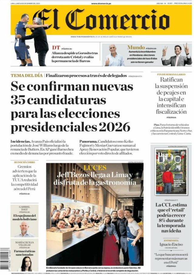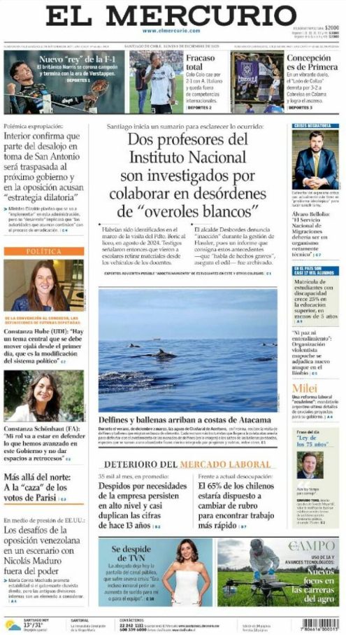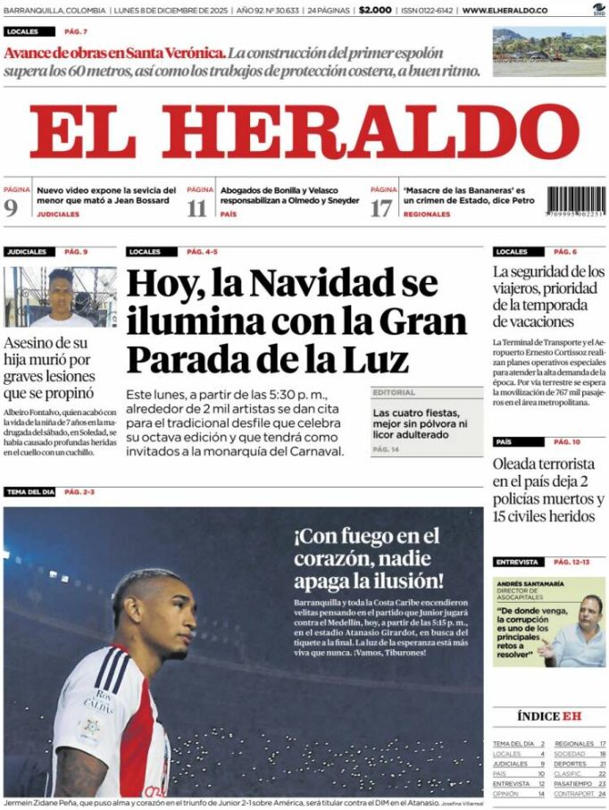 08 Dec 2025, 10:19 • 1 minuto de lectura Portadas latinoamericanas de este lunes 8 de diciembre de 2025 Por La Patilla Compartir Compartir noticia Facebook Twitter / X WhatsApp Telegram LinkedIn Copiar enlace Enlaces relacionados Ver noticia original