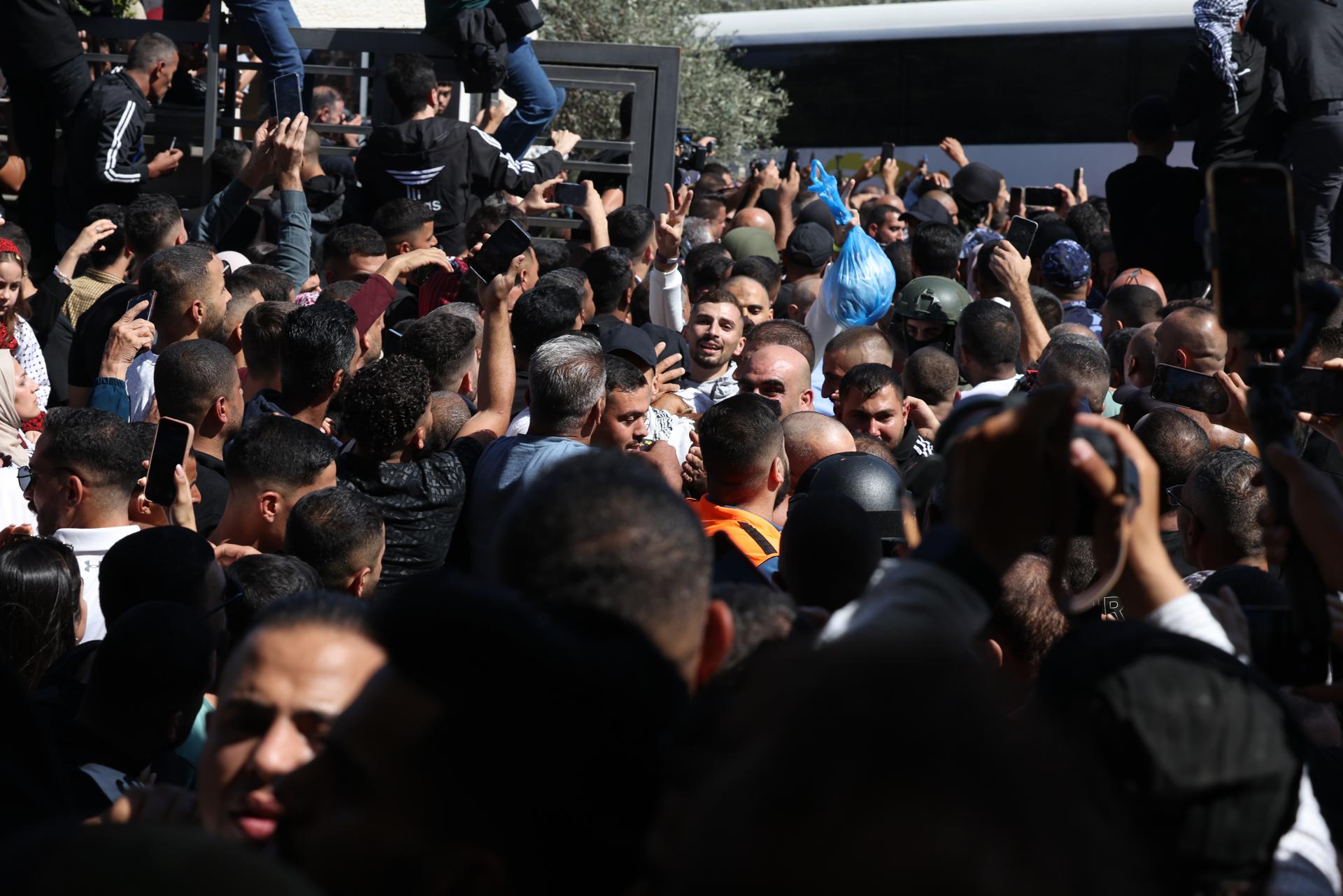 Los palestinos liberados portaban pañuelos palestinos y algunos aparecieron haciendo el signo de la victoria con las manos, antes de abrazar a sus seres queridos. Miembros de la Media Luna Roja les asistieron a su salida de los vehículos.
